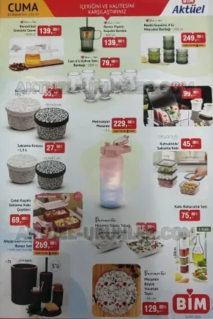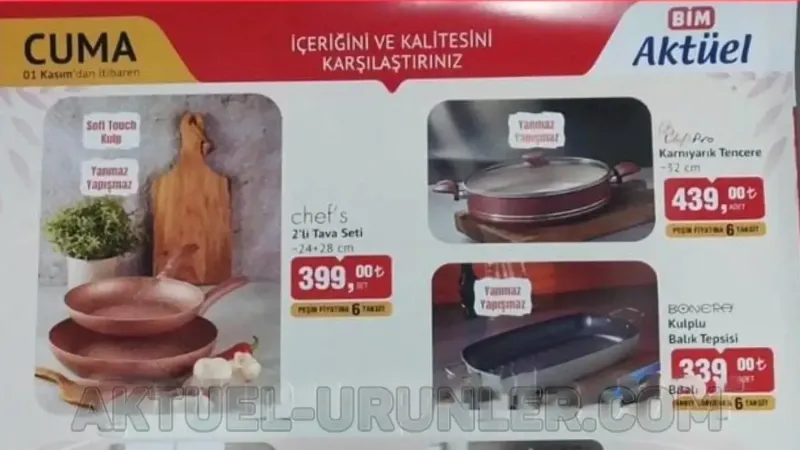 Bim Aktüel indirimli ürünlerinin 1 Kasım 2024 fırsatları Cuma itibarıyla mutfak ekipmanları, çeyiz ürünleri ve züccaciye ürünleriyle dolup taşacak. İhtiyacınız olanı bulma konusunda size yardımcı olan Aktuel-urunler.com ile bu ürünleri keşfetmeye başlayın: Öncelikle Chef’s 2li tava seti şık tasarımıyla ve 24+28cm ebatlarıyla 399 TL’den satılacak. Bu ürünlerin taksit avantajı olduğunu da hatırlatmak gerekir ki; Chef’s Pro karnıyarık tenceresi 439 TL, Bonera kulplu balık tepsisi 339 TL’den sizlerle buluşmakta. Ayrıca her evin olmazsa olmazı çelik çaydanlık ise 799 TL’den bu hafta Bim’e geliyor. Hisar Optima düdüklü tencerede 749 TL gibi muhteşem bir fiyat sunulurken kelepçeli kek kalıbı 26cm sadece 169 TL’den raflarda yer buluyor. Çelik su matarası, cam kupalar, kaseler ve derin tabaklar ile devam eden indirim rüzgarlarında tava koruma aparatı 3lü olarak satılıyor. Tüm bu ürünlerin yanında borosilikat gravürü cezve şık tasarımı ve 139 tl fiyatıyla raflarda yerini alıyor. Saklama kutuları, motivasyonla matarasında fırsatlar sevindirirken; renkli pipetli kapaklı bardak ve renkli gravürü meşrubat bardağı 4lü ürünü yalnızca 249 TL’den satılıyor. Baharatlık setleri 75 tl fiyatla öne çıkacak olup banyo seti beşli olarak 289 liradan alıcı bulacak. Bim kataloglarının ikinci bölümünü ele aldık. 1 Kasım 2024 fırsatları Cuma itibarıyla mutfak ekipmanları, çeyiz ürünleri ve züccaciye ürünleriyle dolup taşacak 1 Kasım 2024 fırsatları Cuma itibarıyla mutfak ekipmanları, çeyiz ürünleri ve züccaciye ürünleriyle dolup taşacak 1 Kasım 2024 fırsatları Cuma itibarıyla mutfak ekipmanları, çeyiz ürünleri ve züccaciye ürünleriyle dolup taşacak