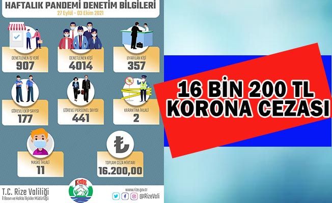 Rize’de 27 Eylül-3 Ekim tarihleri arasında yapılan denetlemeler sonucu pandemi kurallarına uymayan 13 kişiye toplamda 16 bin 200 TL idari para cezası uy- gulanırken, karantina kurallarına uymayan 10 kişi ise ücretleri kendilerinden tahsil edilmek suretiyle otele yerleştirildi. Rize İl Pandemi Kurulu tarafından görevlendirilen 441 kişiden oluşan 177 ekip, Rize ge- nelinde denetimlerini sürdürmeye devam ediyor. 27 Eylül-3 Ekim 2021 tarihleri arasında yapılan pandemi denetimlerinde 4 bin 014 kişiden 357’u uyarıldı. Ayrıca ekipler tarafından il genelinde 907 iş yeri de denetlemeye tabi tutuldu. Denetlemelerde maske ve mesafe kurallarına uymadığı tespit edilen 11 kişiye 6 bin 300 TL, karantina kurallarına uymayan 2 kişiye ise 6 bin 300 TL olmak üzere toplamda 13 kişiye 16 bin 200 TL para cezası kesildi.