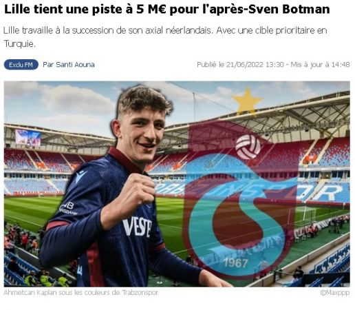 Süper Lig şampiyonu Trabzonspor’da yeni bir transfer gelişmesi yaşandı. Fırtına’nın genç yıldızıAhmetcan Kaplan’ı Fransız ekip Lille’in istediği iddia edildi.Fransız basınında geçen habere göre; Lille'in Sven Botman'ın takımdan ayrılma ihtimaline karşı genç yetenek Ahmetcan için devreye girdiği aktarıldı. Öte yandan Fransız ekibinin Ahmetcan için Bordo-mavili ekibe 5 milyon euro bonservis önereceği ileri sürüldü. Haberin devamında 19 yaşındaki yıldız oyuncu için “Türk futbolcunun en büyük umutlarından biri.” ifadeleri kullanıldı.