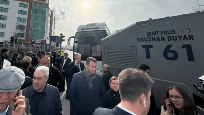 Adliye önünde yoğun güvenlik önlemleri alınırken, polis alanı barikatlarla çevirdi ve TOMA’larla müdahaleye hazır bekledi. Kalabalık nedeniyle gerilim artarken, polisin biber gazıyla müdahale ettiği bildirildi.