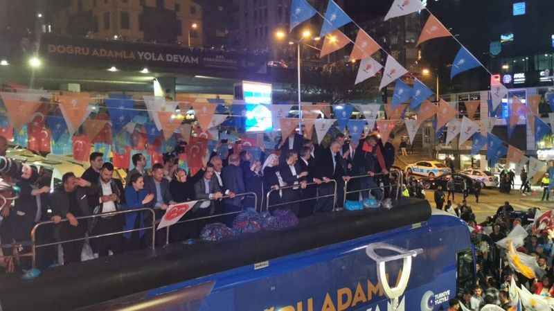 AK Parti Trabzon İl Gençlik Kolları Başkanı Cihan Akyüz, AK Parti Trabzon Milletvekili Adayı Meryem Sürmen , Ortahisar Belediye Başkanı Ahmet Metin Genç, Ayşe Sula Köseoğlu, Trabzon Büyükşehir Belediye Başkanı Murat Zorluoğlu, Milletvekili Vehbi Koç, Milletvekili Yılmaz Türkay'dın, MHP İl Başkanı Ömer Ayar, Haydar Revi, İl Başkanı Sezgin Mumcu ve Ulaştırma ve Altyapı Bakanı Adil Karaismailoğlu, sonuçları kutlayan Trabzon halkını selamladı. Adil Karaismailoğlu, "Yaptıklarımız yapacaklarımızın teminatıdır dedik. Adam kazandı. Doğru adam kazandı Türkiye kazandı öyle bir kazanacağız ki kimse kaybetmeyecek demiştik Türkiye kazandı arkadaşlar. Seçim bitmiştir. Herkes istikrarını Türkiye'nin gelişmesinde yana oyunu kullanmıştır. Trabzon büyüyecek Türkiye büyüyecek Türkiye'nin parlayan yıldızı Trabzon olacak. Hep beraber liderimizin arkasında koşmaya başlıyoruz. Hazır mıyız? Bu aksma bunu coşkulu bir şekilde kutlayacağız ama yarından tezi yok işlerimizin başında olacağız. Hepimiz hayırlı uğurlu olsun. Çok çalıştık çok çabaladık zafere ulaştık."