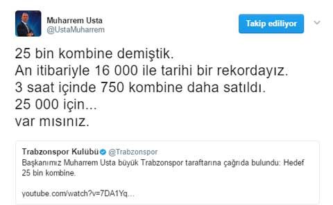 Güncel Yayınlanma: 24 Mart 2017 - 18:46 Güncelleme: 21 Aralık 2022 - 10:42 Başkan usta kombine sayısını açıkladı A Büyüt A Küçült Yorumlar Trabzonspor tarihinde en çok kombinen satıldığı bu sezon ile ilgili Başkan Usta, ''25 bin kombine demiştik. An itibariyle 16 000 ile tarihi bir rekordayız. 3 saat içinde 750 kombine daha satıldı. 25 000 için var mısınız?'' ifadelerine yer verdi. YORUMLAR adlı kullanıcıya cevap x Gönder İlginizi Çekebilir Diyarbakır’da okul servisinde silahlı saldırı: 2 öğrenci yaralı Antalya’daki cinayetin şüphelisi yakalandı Çanakkale – Mendirek ayağında mahsur kalan kedi kurtarıldı Denetimden kaçarken aracıyla 2 polise çarptı, 1 promil alkollü çıktı Son Haberler Foça'daki o taşlar müzeye taşınacak Diyarbakır’da okul servisinde silahlı saldırı: 2 öğrenci yaralı OSB çalışanlarına yerinde tanıtım! Karadeniz’den gelen lezzet mucizesi: Bir kaşık alınca vazgeçemeyeceksiniz!... Gök gürültüsüyle geliyor: Meteoroloji resmen duyurdu! Sağanak kuzeyi,... Çift forvete tam not Çift forvete tam not