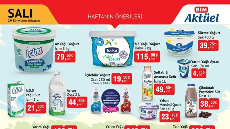 BİM 29 Ekim 2024 Aktüel Ürünler Kataloğu Bim 29 Ekim 2024 kataloğuyla gelecek olan indirimler resmi sitede duyuruldu. Önemli indirimlerin yer alacağı Bim Aktüel kataloglarında raflar ve listeler kampanyayla dolacak. BİM 29 Ekim 2024 aktüel indirimli katalogları salı günü fırsatlarıyla büyük heyecan uyandıracak. Geniş kitlelerce sevilen ve değer verilen Bim Aktüel kataloglarında yeni hafta dolu dolu geçecek. Büyük avantajlarıyla takipçisini sevindirecek olan Bim’de bu hafta 2 sayfada 53 farklı ürün indirim imkanına kavuşacak. İşte fırsatların tam listesiyle Bim indirimleri: Bim Aktüel kataloglarıyla herkese uygun bir fırsat bulmak mümkün. Öncelikle ilk sayfayı ele alalım. Bu sayfada pek çok temel gıda ürünü var. Sizler için ürünlerin ve fiyatların listesini aktaralım.