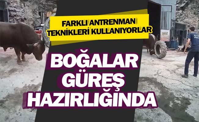 Artvin’de geleneksel olarak düzenlenen boğa güreşleri öncesi boğalar, farklı antrenman teknikleri kullanılarak güreşlere hazırlanıyor. 900 kiloluk ‘Tırpan’ isimli boğa sahibi tarafından iş makinesi tekerlekleriyle güreşlere hazırlanıyor. Artvin merkez ve ilçelerinde her yıl geleneksel olarak düzenlenen boğa güreşleri, bölge de büyük bir sektör oluşturuyor. Baş, başaltı, büyük-orta, küçük-orta, ayak ve deste olmak üzere 6 kategoride gerçekleştirilen boğa güreşleri bölgede yoğun ilgi görüyor. Boğa yetiştiricileri, kentin 1200 rakımlı Kafkasör Yaylası başta olmak üzere, 200 yıldır yaşatılan boğa güreşleri için besledikleri 400 ile 900 kilogram ağırlığında olan boğalara büyük özenle bakıyor. Ot, saman, pekmez, kuru üzüm, arpa ve yumurta ile beslenen boğalar, antrenman yaptırılarak güreşlere hazırlanıyor. Boğalarını farklı antrenmanda teknikleri kullanan güreşlere hazırlayan boğa sahipleri, günlük yürüyüşün yanı sıra, güç kondisyon için ağırlık taşıtıyor. Boğa yetiştiricisi Köksal Avcı (42) ise, 8 yıldır baktığı ve yanından hiç ayırmadığı ‘Tırpan’ isimli boğasını güreşlere hazırlarken ilginç bir yöntem kullanıyor. Aynı zamanda iş makinesi ustası olan Köksal Avcı, tamirhanesinde baktığı boğasını iş makinesi tekerleklerinin kullanarak idman yaptırıyor. Bu sayede boynuz kullanmasını geliştiriyor. Boğanın sporcu gibi tekerlekle antrenman yaptığı görüntüler sosyal medyada paylaşılınca büyük ilgi gördü.