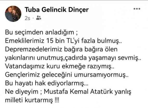 İstanbul Cumhuriyet Başsavcılığı’nca, seçim sonuçlarına ilişkin deprem bölgesindeki seçmenlere yönelik provokatif paylaşımlar yapanlar hakkında resen soruşturma başlatılırken halkın tepkisini çeken bir paylaşım da Çine Belediyesi’nin CHP’li Başkanı Enver Salih Dinçer’in eşi Tuba Gelincik Dinçer’den geldi.Dinçer paylaşımda, “Bu seçimden anladığım; emeklilerimiz 15 bin TL’yi fazla bulmuş, depremzedelerimiz bağıra bağıra ölen yakınlarını unutmuş, çadırda yaşamayı sevmiş. Vatandaşımız kuru ekmeğe razıymış. Gençlerimiz geleceğini umursamıyormuş. Bu hayatı hak ediyorlarmış. Ne diyeyim Mustafa Kemal Atatürk, yanlış milleti kurtarmış” ifadelerini kullandı.Gelen tepkilerin ardından Dinçer, paylaşımını daha sonra sosyal medya hesabından kaldırdı.