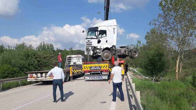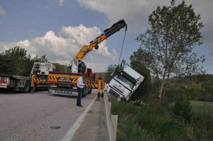 Kaza, Mudurnu ilçesi 100. Yıl mevkiinde meydana geldi. Edinilen bilgiye göre, Ankara’nın Beypazarı ilçesinden Mudurnu istikametine seyreden Muhammet K. yönetimindeki 06 BBC 55 plakalı tır, sürücüsünün kontrolünden çıktı. Direksiyon hakimiyeti kaybolan tır şarampole devrildi. Çevredekilerin ihbarı üzerine bölgeye jandarma ve sağlık ekipleri sevk edildi. Olay yerine ayrıca vinç sevk edildi. Olay yerine gelen sağlık ekiplerince sürücünün sağlık kontrolleri yapıldı. Kazayı sürücü Muhammet K. yara almadan atlattı. Olay yerine gelen vinç yardımıyla devrilen tır ve dorsesi şarampolden kurtarıldı. Kurtarma çalışmaları esnasında uzun araç kuyrukları meydana gelirken jandarma ekipleri tarafından trafik akışı kontrollü olarak sağlandı. Kurtarma çalışmalarının bitmesinin ardından trafik normale döndü. Sürücünün babası, “Traktöre çarpmamak için tırı yatırmış. Eğer vursaydı paramparça olurdu” dedi. Kazayla ilgili inceleme başlatıldı.