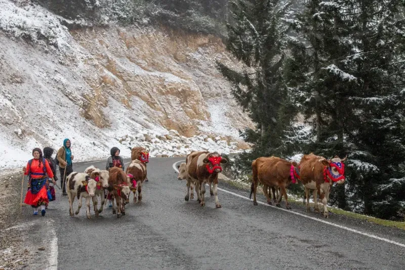 Doğu Karadeniz'de yaz başında küçükbaş ve büyükbaş hayvanlarıyla yaylalara çıkan vatandaşlar, son günlerde etkili olan kar nedeniyle dönüş yolculuğunu hızlandırdı.