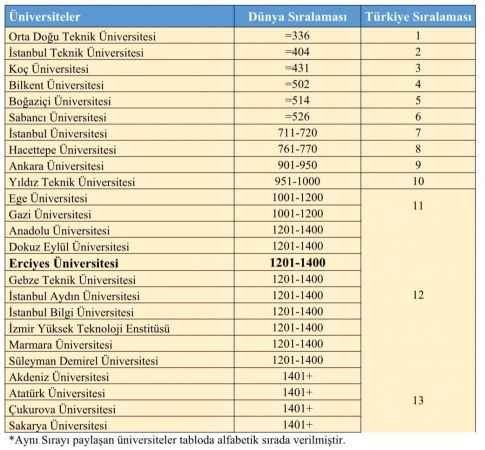 QS Dünya Üniversiteleri Sıralama Sistemi, üniversiteleri Akademik İtibar, İşveren İtibarı, Akademisyen Öğrenci Oranı, Akademisyen Başına Atıf Oranı, Uluslararası Akademisyen Oranı, Uluslararası Öğrenci Oranı, Uluslararası Araştırma İşbirliği, İstihdam Sonuçları ve Sürdürülebilirlik olmak üzere 9 kategoride değerlendiriliyor.Türkiye’den 20’si devlet, 5’i vakıf olmak üzere toplam 25 üniversitenin yer aldığı sıralamada, ERÜ Dünyada 1201-1400 aralığında yer alırken, ülkemizde ise 8 üniversite ile birlikte 12. sırada, devlet üniversiteleri arasında ise 6 üniversite ile birlikte 9. sırada yer alarak önemli bir başarı elde etti.ERÜ Quacquarelli Symonds (QS) Dünya Üniversiteleri 2023 yılı sıralamasında 1401+ aralığında yer alırken, 2024 yılı sıralamasında Akademik İtibar, İşveren İtibarı ve İstihdam Sonuçları göstergelerinde puanlarının artırarak 1201-1400 aralığına yükseldi.