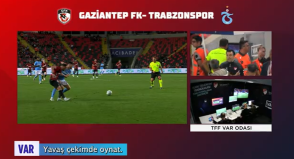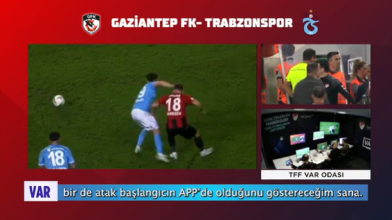 Trendyol Süper Lig'in 6. haftasında deplasmanda 0-0 berabere kaldıkları Gaziantep FK- Trabzonspor maçının VAR kayıtları açıklandı. TFF, Trendyol Süper Lig’in 6. haftasında oynanan Gaziantep FK- Trabzonspor maçının sahada incelemeye giden VAR kayıtlarını paylaştı. Gaziantep FK - Trabzonspor karşılaşmasının 59. dakikasında bordo-mavililerin attığı gol sonrası hakem Volkan Bayarslan, VAR uyarısıyla kenara geldi. Pozisyonu izleyen Bayarslan, atak başlangıcında Trabzonsporlu Malheiro’nun, Sorescu’ya faulyaptığı gerekçesiyle golü iptal etti.