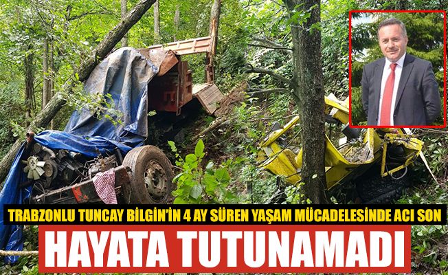 Trabzon’un Sürmene ilçesinde 22 Ağustos’ta trafik kazası geçirerek ağır yaralanan Tuncay Bilgin, 4 aydır hastanede süren yaşam savaşını kaybetti Trabzon’un Sürmene ilçesinde 22 Ağustos’ta trafik kazası geçirerek ağır yaralanan Sürmene Belediye Başkanı Rahmi Üstün’ün makam şoförü Tuncay Bilgin, 4 aydır verdiği yaşam mücadelesini kaybetti. 22 Ağustos’ta arkadaşından emanet almış oluğu kamyonla Dirlik Mahallesi’nde kendi evinin önünden 500 metre uçuruma yuvarlanan Bilgin, zor şartlar altında abisi Osman Bilgin ve arkadaşları tarafından uçurumdan yola taşınarak ambulansla Sürmene Devlet Hastanesi kaldırılmıştı. Burada yapılan ilk müdahalenin ardından Kaşüstü Eğitim Araştırma Hastanesine sevk Bilgin’in 4 aydır verdiği yaşama mücadelesi son buldu. Bilgin cenazesi bugün Eski Cami önünde saat 14:00’de kılınacak cenaze namazının ardından aile kabristanlığında toprağa verilecek. HABER: Songül MAZLUM