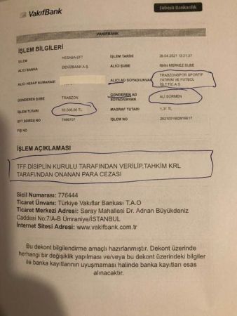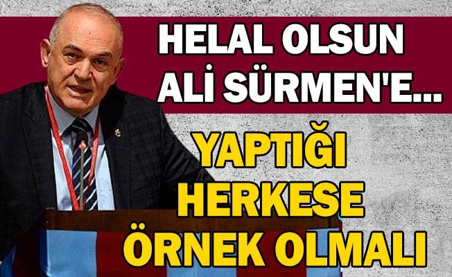 TFF’den 50 bin lira ceza yiyen Ali Sürmen cezayı ödedi...Trabzonspor Divan Kurulu Başkanı Ali Sürmen’e Profesyonel Futbol Disiplin Kurulu (PFDK) tarafından 45 gün hak mahrumiyeti ve 50 bin lira para cezası onanmıştı.Sürmen bugün yaptığı paylaşımla kendisine verilen cezayı ödediğini açıkladı.Sürmen açıklamasında ise şu ifadeleri kullandı: “Sistemsel olarak TFF’nin kulübün hak edişlerinden bugün kestiği para cezasını, derhal kulübün hesabına yatırdım. Camiamızın bilgilerine.” Ali Sürmen'in yaptığının yöneticilere örnek olması istendi.