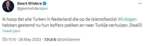 Hollanda'nın ırkçı çıkışlarıyla gündeme gelen siyasetçilerinden Özgürlük Partisi Başkanı Geert Wilders ise tebrik etmek yerine skandal bir paylaşımla gündeme geldi. 2. tur seçimlerinin sonuçlarının ardından kişisel Twitter hesabı üzerinden paylaşımlarda bulunan Wilders, "Hollanda'da İslamofaşist Erdoğan'a oy veren tüm Türklerin artık çantalarını toplayıp Türkiye'ye taşınmasını temenni ediyorum. Güle güle!" ifadesini kullandı.
