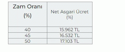 Sabah'ın haberine göre, 6 aylık enflasyon oranları ve memur zam beklentileri dikkate alındığında yüzde 39,61 ve yüzde 51,46 oranının yeni asgari ücret için zam müzakereleri olarak masada yer alması bekleniyor.Buna göre, yeni asgari ücretin yüzde 40, 45 ve 50 formülü üzerinde şekillenmesi bekleniyor. Hesaplanan oranlara göre net asgari ücret tablosu şu şekilde;