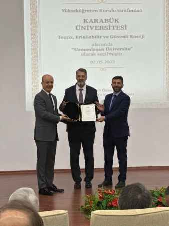 Karabük Üniversitesi Rektörü Prof. Dr. Refik Polat’a Yükseköğretim Kurulu Başkanı Prof. Dr. Erol Özvar tarafından “Uzmanlaşan Üniversite” belgesi takdim edildi. Üniversitelerde belirli bilim alanındaki uzmanlıklarıyla öne çıkan bölüm ve programların, yükseköğretim ekosistemi vasıtasıyla desteklenmesi; ulusal ölçekte nitelikli beşeri kaynağın geliştirilmesi ve uluslararası ölçekte nitelikli bilimsel çıktıların artırılması amacıyla düzenlenen Öncelikli Alanlarda Uzmanlaşan Üniversiteler Projesi’nin tanıtım toplantısı yapıldı.“Öncelikli Alanlarda Uzmanlaşan Üniversiteler Projesi” kapsamında, öncelikli bilim ve Ar-Ge alanlarını belirlemek için YÖK Başkanlığı tarafından 11’inci Kalkınma Planı’nda yer alan öncelikli sektör, alan ve alt alanlar, üniversitelerin alan bazlı yetkinlik analizi raporu, öncelikli ve kilit teknolojilerde teknoloji yol haritaları, TÜBİTAK Ar-Ge ve yenilik konuları gibi çeşitli rapor ve politika dokümanları incelendi. Yapılan değerlendirmeler sonucunda; Yükseköğretim Kurulu tarafından 15 bilim alanında 25 devlet ve vakıf üniversitesinin ilgili bölüm/programlarına öncelikli alan misyonu verilmesi kararlaştırıldı.“Öncelikli Alanlarda Uzmanlaşan Üniversiteler Projesi” toplantısında yapılan konuşmaların ardından Karabük Üniversitesi Rektörü Prof. Dr. Refik Polat’a Yükseköğretim Kurulu Başkanı Prof. Dr. Erol Özvar tarafından temiz, erişilebilir ve güvenli enerji alanında “Uzmanlaşan Üniversite” kategorisinde belge takdim edildi.Bu kapsamda üniversitelerde, enerji kaynaklarının ve enerjinin verimli ve etkin kullanılması, israfın önlenmesi ve yenilenebilir enerji kullanımının sağlanması ile enerji maliyetinin bütçe üzerindeki yükünün hafifletilmesi, sıfır atık uygulamalarının yaygınlaştırılması, çevrenin korunması, üniversitelerin sürdürülebilir ve iklim dostu kampüs dönüşümü sürecinde gerekli finansman araçlarına erişimi konusunda desteklenmesi yönünde çalışmalar yapılması hedefleniyor.
