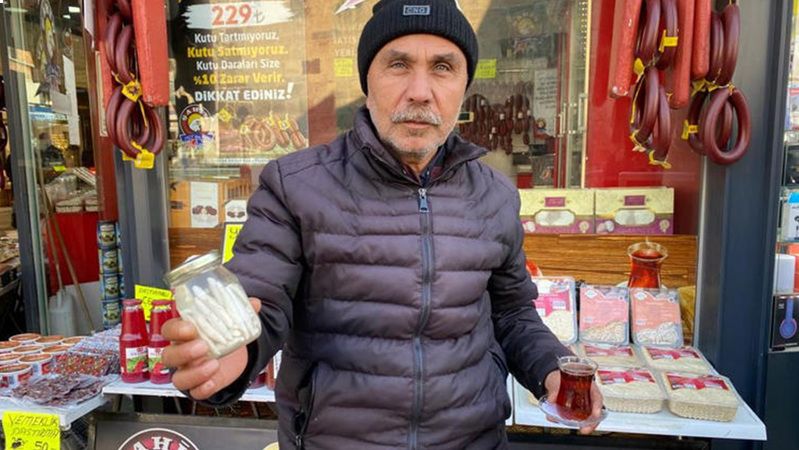 Temmuz ayı gibi toprağı eşerler ve bu bitkinin altından akan süt donarak, sakız olur. Şu anda sakız olarak çiğneniyor. Bunun birçok faydası daha var. Yüz felci, migren ağrısı, kulak tıkanması, gastrit gibi rahatsızlığı bulunan vatandaşlar için faydalıdır. Dolabın normal bir gözüne koyduğunuzda bu sakız aynı tazelikte 1 buçuk yıl durur. Sulu vaziyette koymanız gerekiyor. Bu sayede 1 buçuk yıl durur. Bu sakız biraz serttir. Çiğnedikçe yumuşar, yumuşadıkça da harika bir tadı olur. Güzel bir aroması olur. Normalde bunun kilosu 2 bin 500 TL. Şu anda boksörler dahil çene kaslarını geliştirmek için bizden bu sakızı alıyor. Çünkü bu sert olduğu için çene kaslarını geliştirir" dedi.