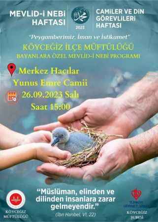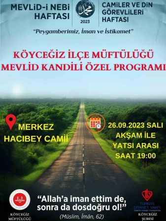Muğla’nın Köyceğiz ilçesinde Mevlid Kandili nedeniyle özel programlar düzenlendi. Bu sene ’Peygamberimiz, İman ve İstikamet’ temasıyla kutlanacak olan Mevlid-i Nebi Haftasında ilk olarak; 26 Eylül Salı günü saat 15:00’ da Köyceğiz Merkez Hacılar Yunus Emre Camiinde bayanlara yönelik Mevlid Kandili özel programı gerçekleşecek. Kandil günü akşam namazı ile yatsı namazı arasında da Merkez Hacı Bey Camiinde genele yönelik Kandil özel programı ve 27 Eylül Çarşamba günü de Beyobası Merkez Camiinde sabah namazı buluşması programı yapılacak.Köyceğiz İlçe Müftüsü Ahmet Karagöz; “Mevlid Kandilinin idraki ile başlayacak ve 26 Eylül 2023 ile 7 Ekim 2023 tarihleri arasında kutlanacak olan Mevlid-i Nebi Haftası ile Camiler ve Din Görevlileri Haftası etkinliklerimize bütün kardeşlerimizi davet eder, Mevlid Kandilinin bütün insanlığa sevgi, rahmet, huzur ve barış getirmesini, Sevgili Peygamberimizi daha iyi tanımamıza vesile olmasını Cenab-ı Allahtan niyaz ederim” dedi.