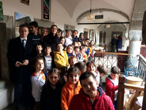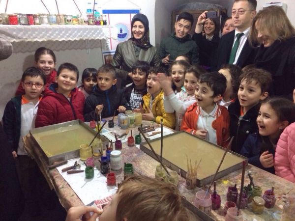 61MEDYA/UMUT ANIL-Trabzon’da ebru sanatçısı Songül Kartal ve Öğretmen Fatma Atasoy tarafından ortaklaşa düzenlenen bir program ile Ortahisar ilçesine bağlı Dumlupınar İlkokulu 1/E sınıfı öğrencilerine ata sanatımız olan "ebru" tanıtıldı. Trabzon Valiliği Kadın İstihdamı Geliştirme Merkezi (KİGEM) ev sahipliğinde Alacahan'da gerçekleşen etkinlikte öncelikle sanatçı Songül Kartal, 32 minik öğrenciye UNESCO Dünya Somut Olmayan Kültürel Miras Listesine alınan ebru sanatı hakkında bilgilendirme yaptı. Ardından Kartal, asistanı Oroz Salmoorbekov ve öğrencileri tarafından tarihî mekânda miniklerin her birine ayrı ayrı ebru sanatı uygulaması yaptırdı. Minikler bu renkli etkinliğin sonunda hem eğlendi hem de birbirinden güzel çalışmalara imza attı. Minik ziyaretçilerin mutlulukları gözden kaçmadı. Program minik öğrencilerin öğretmenleri Fatma Atasoy ve Müdür Yardımcısı Hamdi Yiğit eşlinde Alacahan gezisiyle sona erdi.