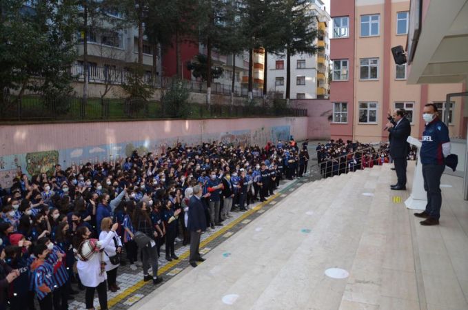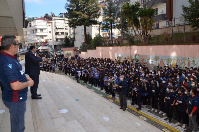 Beşirli İMKB Ortaokulunda tüm öğrencilere bir hayırsever tarafından Trabzonspor forması hediye edildi. Okul bahçesinde öğrenciler bordo mavi formalarıyla sevinç şarkıları söyledi. Ortahisar İlçe Milli Eğitim Müdürü Cemil Karakaş, “Beşirli İMKB Ortaokulumuzda tüm öğrencilerimizi mutlu eden bir hayırseverimiz tarafından Trabzonspor forması hediye edildi.Hayırseverimize ve katkı sunan veli, öğretmen ve idarecilerimize şükranlarımızı sunarız. O sene bu sene inşallah.” İfadelerini kullandı.