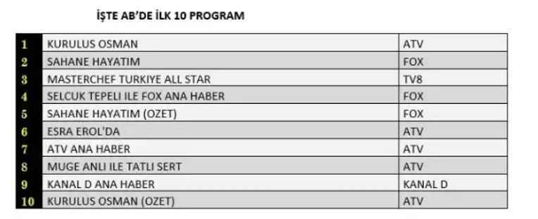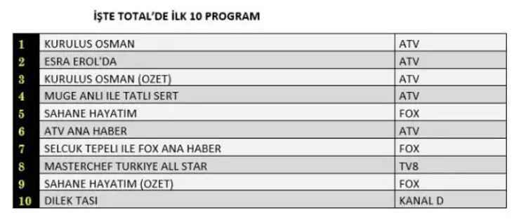 Televizyon dizilerini ve programlarını takip eden vatandaşlar büyük bir heyecanla günlük reyting takibi yapıyor. Bu sebeple, 29 Kasım Çarşamba reyting sonuçları büyük bir merakla araştırılıyor. İşte, 29 Kasım Çarşamba reyting sonuçları! ATV, Kanal D, FOX, Show, Star TV, TV8 reyting sonuçları. Sosyal medyada yer alan iddialara göre:29 Kasım tarihinde yayınlanan programların reyting sonuçları açıklandı. Total'de 1.sırada ATV’de izleyiciyle buluşan “Kuruluş Osman”, 2. sırada ATV’de yayınlanan “Esra Erol’da”, 3.sırada ATV'de ekrana gelen “Kuruluş Osman özeti” yer aldı. AB'de ise 1.sırada ATV’de ekrana gelen “Kuruluş Osman”, 2.sırada FOX TV’de yayınlanan “Şahane Hayatım”, 3.sırada “Masterchef Türkiye All Star” yer aldı.