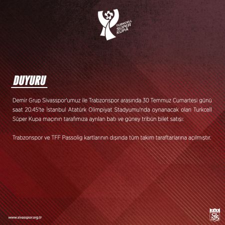 Sivasspor cumartesi günü Trabzonspor ile oynayacağı Süper Kupa öncesi bir paylaşım yaptı. Sivasspor'un resmi sosyal medya hesabından yaptığı duyuruda kendilerine ayrıltılan bölgeye diğer kulüp taraftalarını çağırması dikkat çekti. Yapılan paylaşım şöyle: "Demir Grup Sivasspor'umuz ile Trabzonspor arasında 30 Temmuz Cumartesi 20.45'te Atatürk Olimpiyat Stadyumu'nda oynanacak Süper Kupa maçının tarafımıza ayrılan batı ve güney tribün bilet satışı: Trabzonspor ve TFF Passolig kartlarının dışında tüm takım taraftarlarına açılmıştır."
