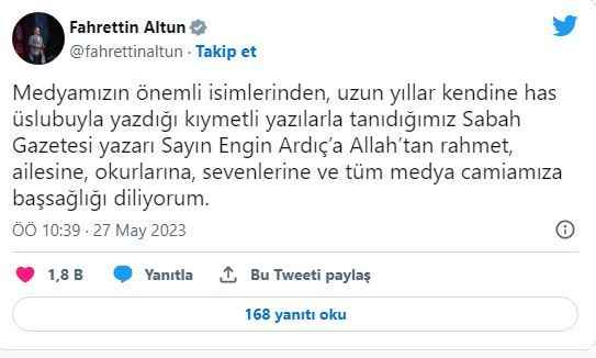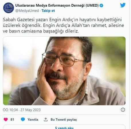 Sabah gazetesi yazarı Engin Ardıç, tedavi gördüğü hastanede hayatını kaybetti. İLETİŞİM BAŞKANI'NDAN MESAJİletişim Başkanı Fahrettin Altun, "Medyamızın önemli isimlerinden, uzun yıllar kendine has üslubuyla yazdığı kıymetli yazılarla tanıdığımız Sabah Gazetesi yazarı Sayın Engin Ardıç’a Allah’tan rahmet, ailesine, okurlarına, sevenlerine ve tüm medya camiamıza başsağlığı diliyorum" paylaşımını yaptı. UMED'DEN BAŞSAĞLIĞI MESAJIUluslararası Medya Enformasyon Derneği, Ardıç'ın vefatının ardından başsağlığı mesajı yayımladı. ENGİN ARDIÇ KİMDİR?Engin Ardıç, 1 Şubat 1952 yılında Trabzon'da dünyaya geldi. Babasının adı Mustafa Şevki, annesinin adı Vesile'dir. Doğduğu Trabzon'da anne ve babası memur olarak görevli bulunuyordu. Ardıç, Robert Koleji ve Galatasaray Lisesi'ni, ardından 1976 yılında Boğaziçi Üniversitesi Siyasal Bilimler Bölümü'nü bitirdi.Gazetecilik mesleğine 1970 yılında, "Tiyatro '70" adlı dergide yazılar yazarak başladı. Reklam yazarlığı, BBC Türkçe yayınlar servisi spikerliği, "Cumhuriyet" ve "Politika" gazetelerinde tiyatro ve edebiyat eleştirmenliği yaptı. "Nokta" dergisinde yayın danışmanlığı görevini yürüttü. " Dünya, Sabah, Star" ve "Akşam" gazetelerinde köşe yazarlığı yaptı. Star TV'de ana haber bülteni sonrasında "Günün Yorumu" adlı programı sundu.