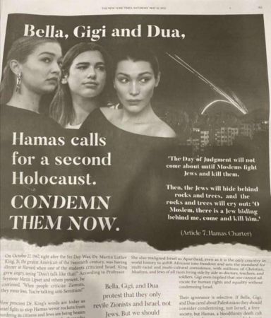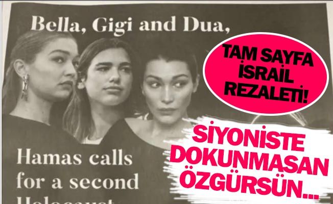 ilistin asıllı ABD'li modeller Bella Hadid ile kardeşi Gigi Hadid ve yine Filistin'e destek veren şarkısı Dua Lipa, NYT gazetesinde yer alan tam sayfa bir ilanda "İsrail'i kınayıp Hamas'a sessiz kalmakla" suçlandı. Filistin'e destek veren 3 ünlü ismi hedef gösteren New York Times'taki ilan tepki gördü Amerikalı haham Shmuley Boteach'in başında olduğu "Dünya Değerler Ağı" adlı örgüt tarafından verilen ilan, Filistin'e destek veren 3 ünlü ismi doğrudan hedef gösterdiği gerekçesiyle sosyal medyada yoğun tepkilerle karşılaştı. Paylaşımlarında bu ilanı basan NYT gazetesine de tepki gösteren çok sayıda kullanıcı, gazetenin böyle bir ilanı yayınladıktan sonra tarafsızlığını koruduğunu iddia edemeyeceğine vurgu yaptı. Bella Hadid, Filistin halkı için sokağa çıktı! Hadid kardeşler ile Lipa'nın fotoğraflarına yer verilen ilanda, "Bella, Gigi, Dua; Hamas ikinci Holokost çağrısı yapıyor. Onları derhal kınayın." ifadeleri kullanıldı. Bella Hadid, olayların başladığı ilk günlerde sosyal medya hesabı üzerinden yaptığı paylaşımda, "Eğer Amerikalıysanız bilin ki ödediğiniz vergilerin bu yaşananlarda payı var! İsrail'e her yıl 3,8 milyar dolar ödüyoruz. Bunu biliyor muydunuz?" demişti. Hadid, New York'ta yapılan ve kendisinin de katıldığı Filistin'e destek yürüyüşünden kareler paylaşarak, "Şu an böyle hissediyorum. Bu kadar güzel, zeki, saygılı, sevgi dolu, kibar ve cömert Filistinlinin etrafında olmak... Bütün hissettiriyor. Filistin özgür kalana kadar Filistin'e özgürlük." diye yazmıştı.