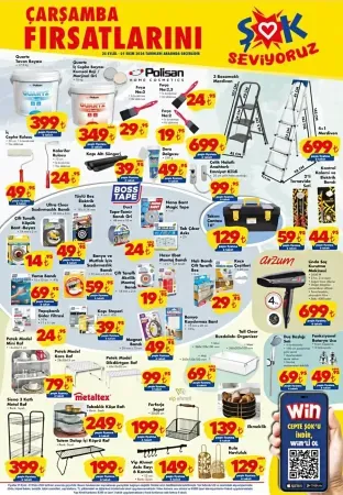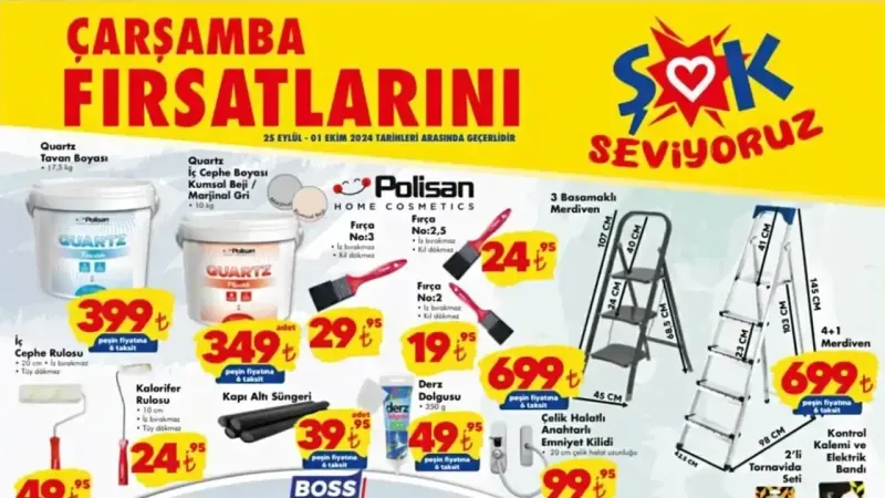 ŞOK 25 Eylül 2024 kataloglarında bu hafta fevkalade indirimler var. Şok Aktüel ürünler kataloğuna ait fırsat detayları sizlerle burada buluşuyor. Şok Market bu hafta sayfalarında bulunan ve zaruri olarak nitelendirilebilen ürünlerin listelendiği katalogları etraflıca inceleyeceğiz.ŞOK aktüel ürünlerinde bu hafta altı basılı sayfadan oluşan fırsat broşürü yayınlandı. Şok 25 Eylül 2024 kataloglarında kamp ürünleri, oyuncaklar, boya/badana ürünleri, tamir bantları, mutfak ekipmanları, gıda ve temizlik ürünleri ile “Şok Ekstra Ürünler” adı verilen sınırlı stoklu fırsatlar bulunuyor. Bu haftanın Şok aktüel 25 Eylül 2024 ürünlerini sizlere en detaylı biçimde aktarmaya çalışacağız. Başlıyoruz: ŞOK 25 Eylül 2024 yeni sayfaları oldukça makul fiyatlarla kaliteli ürünleri bir arada sunuyor. Şok Market zaten kaliteli ürün satmasıyla bilindiği için bu kaliteyle ucuzu birleştirmek çok da zor olmamış. Alışverişlerinizi uygun fiyatlı olarak yapmanız için 25 Eylül 2024 günü başlayıp 1 Ekim 2024 tarihine dek sürecek fırsat kataloglarını ele alıyoruz. ŞOK Aktüel için alışveriş rehberi niteliğindeki incelememizden faydalanarak siz de fırsatları kaçırmayabilirsiniz. Öne çıkan ürünleri incelememize sıklıkla dahil etsek de diğer tüm fırsatları da katalog sayfalarından incelemeniz gerekeceğinden sayfa devamında katalogları da her daim ekliyoruz, bulabilirsiniz.25 Eylül 2024 Şok kataloğunun ilk sayfasında boya/badana ürünleri bulunuyor. Quartz tavan boyası ve iç cephe boyası ürünleri ile birlikte Polisan fırça çeşitleri (no:3, no:2,5 ve no:2) raflara giriyor. İç cephe rulosu, kalorifer rulosu gibi ürünlerle derz dolgu, kapı altı süngeri ürünleri boya ve tamir ürünleriniz için işinizi fevkalade kolaylaştırmak üzere raflara geliyor. Boya yaparken ihtiyacınız olacak olan merdivenlerde de fırsatlar bulunuyor. 3 basamaklı merdiven ve 4+1 merdiven ürünleri erişim imkanınızı sağlamak üzere geliyor. Ayrıca Boss Tape markasına sahip olan çok sayıda bant ürünü, farklı kullanım amaçlarına uygun olarak Şok’a geliyor. Bu kullanım amaçları arasında sızdırmazlık, elektrik, kaydırmazlık gibi seçenekler bulunuyor. Siz de neye ihtiyacınız varsa o amaca uygun olarak bir Boss Tape bantı Şok 25 Eylül kataloglarından edinebilirsiniz. Sayfada bulunan bir diğer üründe Arzum Linda saç kurutma makinesi bulunuyor. Ürün 2000W gücünde, 4000 stoklu, 2 hız ve 2 ısı ayarlı olarak satılıyor. Ayrıca temizlenebilen filtresiyle kullanım kolaylığı sağlıyor. Difüzör başlığı da unutmamak gerek… Sonraki bölümlerde Metaltex tabaklık köşe rafları, Siena 3 katlı metal raflarla mutfağınız için gerekli ve lüzumlu olabilecek çok sayıda züccaciye ürünü listelere dahil oluyor. Bunlarla birlikte Petek Model dikdörtgen raflar, kare ve mini raflar da şık tasarımlarıyla dikkatleri üzerine çekiyor. Son olarak ise duş başlığı, fonksiyonel batarya ucu gibi sıklıkla değişen ürünler sizleri uygun fiyatıyla takip ediyor.