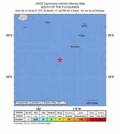 ABD Jeolojik Araştırma Merkezi (USGS), Büyük Okyanus’ta yer alan ada ülkesi Tonga açıklarında 7.2 büyüklüğünde deprem meydana geldiğini bildirdi. USGS, Depremin merkez üssünün Tonga’nın yaklaşık 280 kilometre güneybatısında ve 167,4 kilometre derinlikte olduğunu aktardı.Deprem sonrası tsunami uyarısı yapılmazken, can ve mal kaybı bildirilmedi.