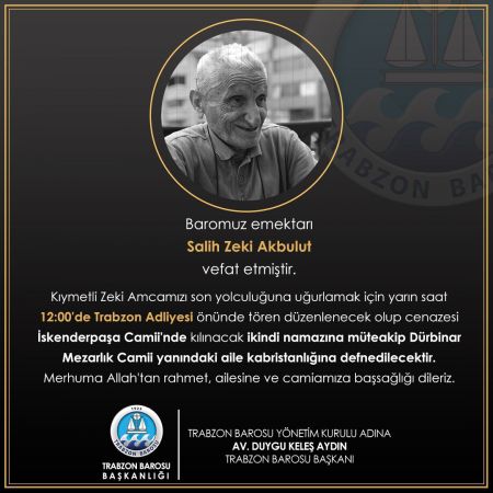 Trabzon Barosunun emektar ismi Salih Zeki Akbulut hayatını kaybetti. Trabzon Barosunu acı haberi duyurdu. Trabzon Barosundan şu ifadeleri kullandı:"Baromuz emektarı Salih Zeki Akbulut vefat etmiştir. Kıymetli Zeki Amcamızı son yolculuğuna uğurlamak için yarın saat 12:00'de Trabzon Adliyesi önünde tören düzenlenecek olup cenazesi İskenderpaşa Camii'nde kılınacak ikindi namazına müteakip aile kabristanlığına defnedilecektir. Merhuma Allah'tan rahmet, ailesine ve camiamıza başsağlığı dileriz. Trabzon Barosu Başkanlığı."