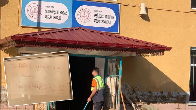 Trabzon Büyükşehir Belediyesi ekipleri, son günlerde yoğun yağışlar nedeniyle sel ve heyelanların etkili olduğu Araklı, Arsin, Sürmene, Yomra ve Vakfıkebir ilçelerinde yoğun bir çalışma yürütüyor. Özellikle eğitim öğretim kurumlarının temizlenmesine ayrı bir özen gösteren ekipler, Arsin Yeşilköy Şehit Haydar Arslan İlkokulu/Ortaokulu'nda anlamlı bir harekete imza attı. Ekipler, temizledikleri sınıfın tahtasına içten bir not bırakarak duyguları dile getirdi.