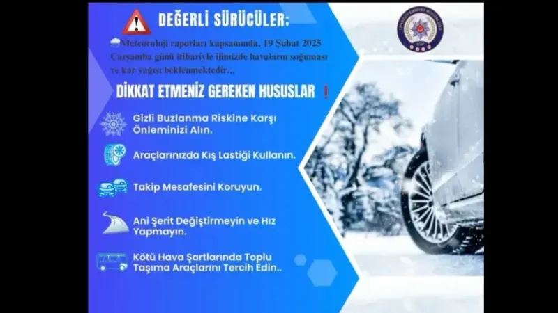 Trabzon Emniyet Müdürlüğü, 19 Şubat 2025 Çarşamba günü itibarıyla hava sıcaklıklarının düşeceğini ve kar yağışının beklendiğini duyurdu.Sürücüler için özellikle kar yağışı ve gizli buzlanma riski nedeniyle güvenli sürüş önlemleri alması gerektiği vurgulandı.
