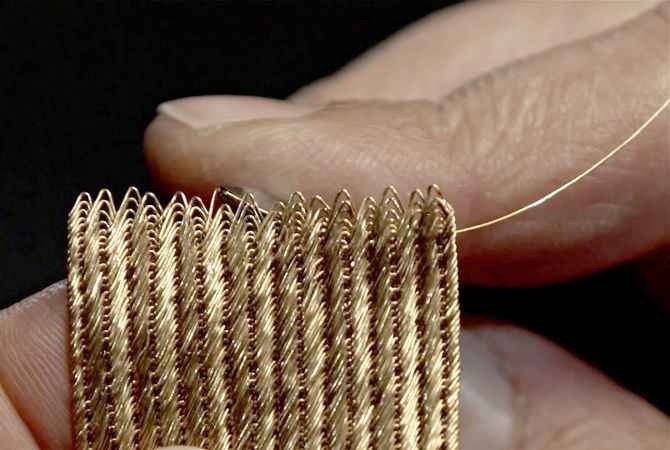 - Örme tekniği: 31 ile 32 mikron inceliğinde altın veya gümüş teller, ilmek ilmek örülür.