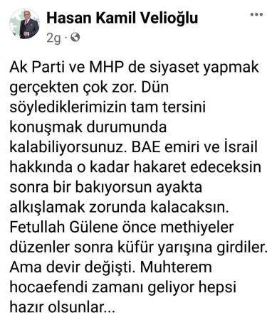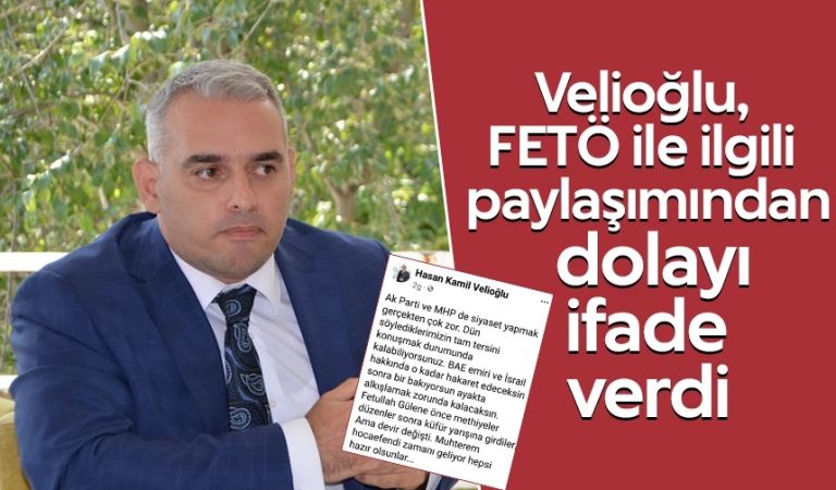 Songül MAZLUM-Gelecek Partisi Trabzon İl Başkanı Hasan Kamil Velioğlu, Savcılıkta FETÖ ile ilgili yaptığı bir sosyal medya paylaşımı yüzünden ifade verdi. Başkan Velioğlu’nun “AK Parti ve MHP de siyaset yapmak gerçekten çok zor. Dün söylediklerimizin tam tersini konuşmak durumunda kalabiliyorsunuz. BAE emiri ve İsrail hakkında o kadar hakaret edeceksin sonra bir bakıyorsun ayakta alkışlamak zorunda kalacaksın. Fetullah Gülen’e önce methiyeler düzenler sonra küfür yarışına girdiler. Ama devir değişti. muhterem hocaefendi zamanı geliyor hepsi hazır olsunlar…” paylaşımı yüzünden ifadesi alındı.