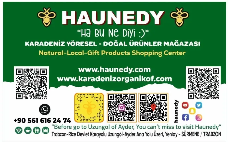 Haunedy Karadeniz Yöresel Ürünler Mağazasında mağaza sahibi Ali Rıza Köroğlu ve personel tarafından karşılanan Trabzon Seyret Sosyal Medya Kanalı ekibi, mağazadaki doğal, yöresel ve organik ürünleri inceledi. Haunedy Mağazasındaki organik ballar konusunda bilgi alan Trabzon Seyret ekibi, balların tümünün Tarım Bakanlığından onaylı, etiketli ve tahlilli olmasının çok önemli olduğuna vurgu yaptılar.Trabzon HaunedyTrabzon HaunedyHaunedy Karadeniz Yöresel Ürünler Mağazası yetkilisi Yasin Köroğlu, mağaza hakkında bilgi verirken şunları söyledi; “ Türkiye'nin her tarafından tur acenta şirketleri ile gelen misafirlerimiz mağazamıza uğrayıp, yöresel ürünlerimizi tadabilmektedir. www.haunedy.com sitemiz, daha çok tur acenta turizm şirketlerimize yönelik bilgilendirme ve konum amaçlı sitemizdir. www.karadenizorganikof.com sitemiz ise, Türkiye geneli ve yurt dışı web satış sitemizdir. Mağazamızdaki ürünlerin satış fiyatları ile web sitemizdeki ürünlerin satış fiyatları birebir aynıdır. İl dışından otobüslerle gelen tüm misafirlerimize, yöremize özgü kuymak sunumu ve ikramı yapmaktayız. Haunedy Karadeniz Doğal Yöresel Hediyelik Ürünler Alışveriş Merkezimiz, Rize Şehr-i Anzer Tarımsal Kalkınma Kooperatifi Mühürlü Anzer Balı ve Anzer Ürünleri resmi satış yeridir. İçerisinde birçok vitamin ve mineral bulunan Anzer Balı, Rize İkizdere Anzer Yaylasının bitki florasında, dünyada çok az görülen 500’ün üzerinde çiçekten, bunların da 100’e yakını sadece Anzer Yaylasında bulunan endemik çiçekleriden bal arılarının topladığı şifa balıdır. Anzer balının antioksidan özelliği sayesinde bağışıklık sistemini güçlendirdiği ve vücudu hastalıklara karşı koruduğu bilinmektedir. Yetişkinlerin günde bir ahşap tatlı kaşığı ve 2 yaşından büyük çocukların da günde bir ahşap çay kaşığı kadar Anzer Balı tüketmeleri tavsiye edilmektedir. Haunedy Mağazamızda Anzer Kooperatifinden Mühürlü Anzer Balı, Mühürlü Anzer Poleni, Anzer Propolisi ve Anzer Atom Karışımı satılmakdatır. Kestane Balı, Çiçek Balı, Karakovan Petek Balı, Çam Balı, Sedir Balı, Deli Bal gibi tüm bal çeşitlerimiz ile polen, propolis ve arı sütü gibi arı ürünlerimiz Tarım Bakanlığından onaylı, prolin değerlerleri yüksek, katkısız birinci sınıf ürünlerdir. Lokum, baklava, bal, çikolata, kahve, çay, baharat, kozmetik, bakır, hediyelik gibi ürünlerde de en doğalını, en iyisini ve en kalitelisini misafirlerimize sunmaya çalışmaktayız.” dedi.Trabzon Seyret ekibinin Haunedy ziyareti, hatıra fotoğrafı çekimi ile sona erdi.
