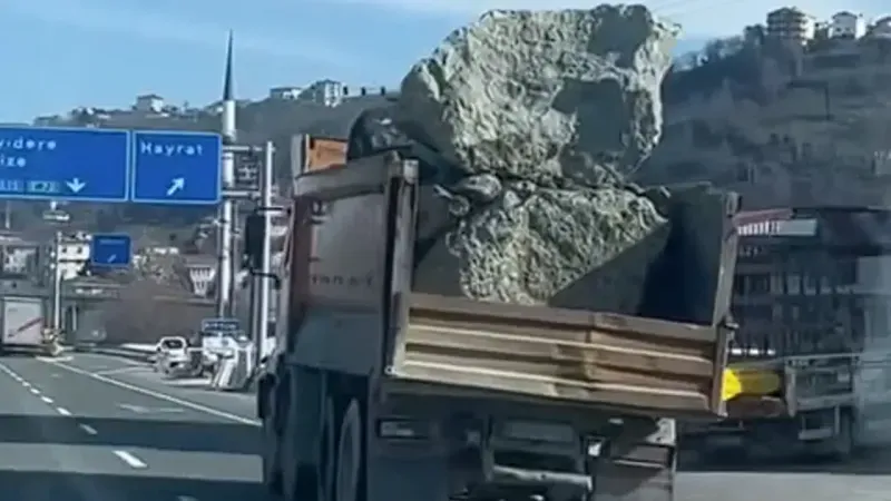 Trabzon’un Sürmene ilçesi Sahil Yolu Caddesi'nde seyir halinde ilerleyen önlemsiz yük kamyonu, vatandaşların tepkisine neden oldu.Kamyonun güvenlik önlemi almadan kaya taşıdığı görüntüler sosyal medyada hızla yayıldı.