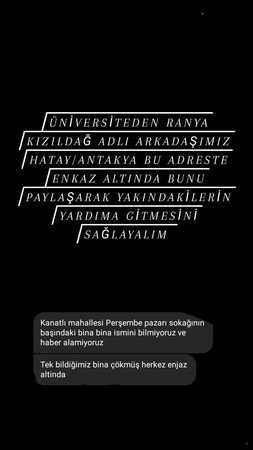 Trabzon Üniversitesi Türkçe Öğretmenliği 2'nci sınıf öğrencilerinden Rana Kızıldağ adlı öğrencinin Hatay/Antakya'da göçük altında olduğu öğrenildi. Kızıldağ'dan haber alınamadığı ve bulunduğu binanın çöktüğü bilgisi bulunuyor. Trabzon Üniversitesi öğrencilerinin haberleşmek için kurduğu iletişim grubunda, genç kız için çağrıda bulunuluyor. Ekiplerin ulaşması için genç kızın ev adresinin bilinen bölümü gruplarda şu şekilde paylaşıldı, "Kanatlı Mahallesi, Perşembe Pazarı Sokağı'nın başında bulunan bina, binanın adı bilinmiyor. Binanın çöktüğü bilgisine ulaşıldı. Arkadaşımızdan haber alamıyoruz."