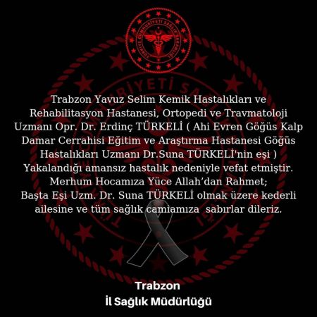 Trabzon'da Yavuz Selim Kemik Hastalıkları ve Rehabilitasyon Hastanesi'nde görev yapan doktor hayatını kaybetti. Trabzon Yavuz Selim Kemik Hastalıkları ve Rehabilitasyon Hastanesi, Ortopedi ve Travmatoloji Uzmanı Opr. Dr. Erdinç Türkeli yakalandığı amansız hastalık nedeniyle hayatını kaybetti.Trabzon İl Sağlık Müdürlüğü yaptığı açıklamada başta eşi Ahi Evren Gögüs Kalp Damar Cerrahisi Eğitim ve Araştrıma Hastanesi Göğüs Hastalıkları Uzmanı Dr. Suna Türkeli olmak üzere ailesine ve tüm sağlık camiasına sabırlar diledi.