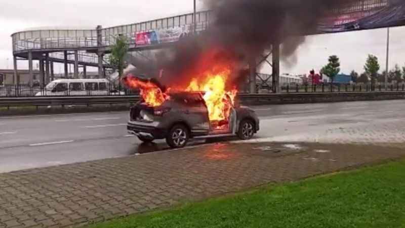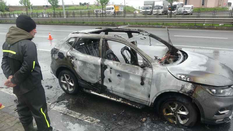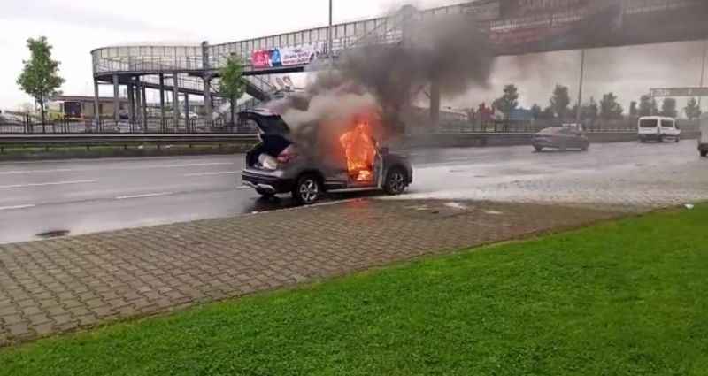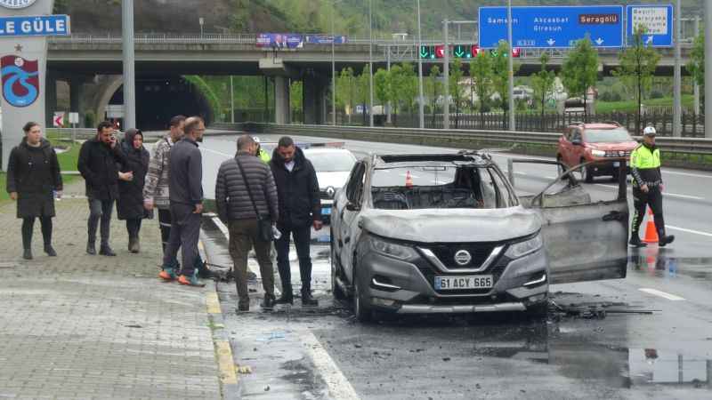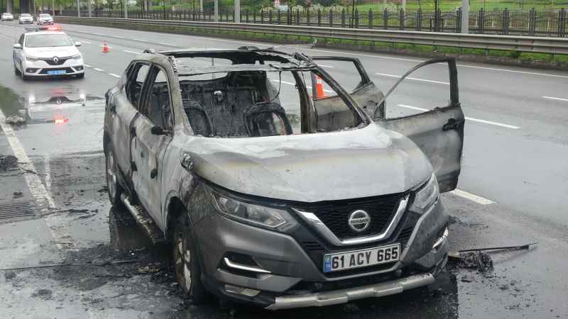 Trabzon’un Ortahisar ilçesinde kadın sürücünün kullandığı cip, seyir halindeyken bir anda yanmaya başladı. Aracın çakmaklık kısmında yükselen dumanları fark eden sürücü, dakikalar içerisinde alevlerin sardığı araçtan son anda kurtuldu. Olay, sabah saatlerinde Ortahisar ilçesinin Akyazı Mahallesi'nde meydana geldi. Edinilen bilgiye göre, Karadeniz Sahil Yolu Trabzon- Rize istikametinde gitmekte olan Esra Kızıler (39) yönetimindeki 61 ACY 665 plakalı Nissan marka cipin çakmaklığında yangın çıktı. Akyazı tünellerinden geçtiği esnada çakmaklıktan çıkan dumanları fark ederek tünel çıkışında aracını durduran kadın sürücü yangın söndürme tüpü ile müdahale etmek istedi. Yangın söndürme tüpünün çalışmaması nedeniyle alevlere müdahale edemeyen sürücüyü gören çevredeki vatandaşlar durumu 112 Acil Çağrı Merkezine bildirdi. İhbar üzerine olay yerine polis, sağlık ve itfaiye ekipleri sevk edilirken, olay yerine gelen itfaiye ekiplerince alev topuna dönen araçtaki yangın kısa sürüde kontrol altına alındı. Yangın sonrası otomobil hurdaya dönerken, kadın sürücü korku dolu anlar yaşadı. Aracında çıkan yangına müdahale etmeye çalıştığını belirten sürücü Esra Kızıler, “Tünelde seyir halindeyken koku aldım. İlk başta kokunun tünel içinden geldiğini düşündüm. Sonrasında fark ettim çakmaklığın oradan bir duman geliyor. Tünelden çıktığım gibi sağa yaklaştım. Çakmaklık bölümünün ısındığını ve eridiğini gördüm. Yangın söndürme tüpünü çıkardım ama çalıştıramadım. Battaniye ile yangının çıkış yerinin üstünü kapatmaya çalıştım ama o bölüm erimişti. Sonra yangın büyüdü. Söndürmeye çalışırken elim hafif şekilde yandı” dedi. Yangın sonrası kullanılamaz hale gelen araç, çekici ile bulunduğu yerden kaldırıldı.