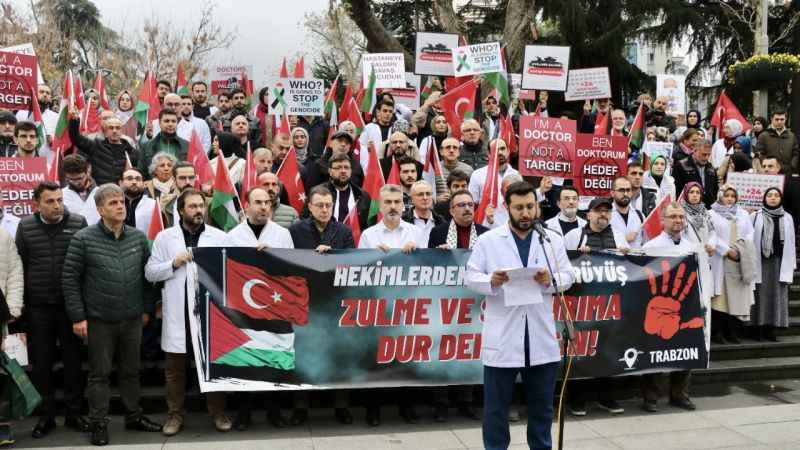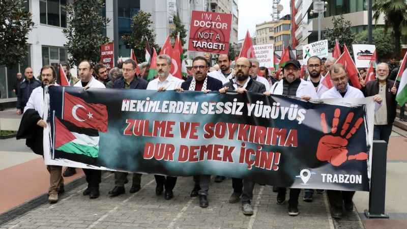 Trabzon, Rize ve Bayburt'ta hastanelerde görev yapan doktor ve sağlık çalışanları, İsrail'in Gazze'ye yönelik saldırılarını protesto için sessiz yürüyüş düzenledi.Trabzon'daki çeşitli hastanelerde görev yapan sağlık çalışanları Kahramanmaraş Caddesi'nde bir araya geldi.Türk ve Filistin bayrakları ile İsrail aleyhine çeşitli yazıların yer aldığı dövizleri taşıyan grup, Atatürk Alanı'na kadar "Hekimlerden Sessiz Yürüyüş" gerçekleştirdi.
