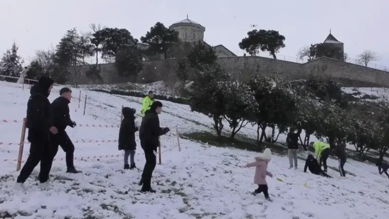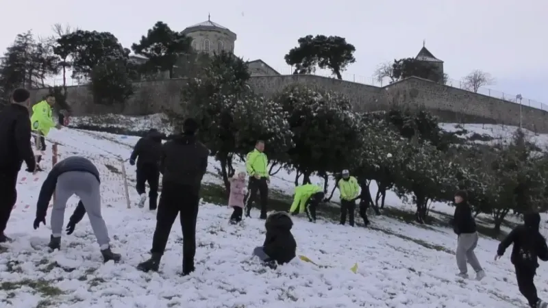 Trabzon’da etkili olan kar yağışı ile birlikte kent beyaza büründü.Yoğun kar yağışı ve buzlanma nedeniyle il genelinde tüm eğitim ve öğretim kurumlarında verilen 2 günlük tatil ile birlikte çocuklar soluğu sokak ve parklarda aldı.Naylon poşetlerle birlikte Ayasofya Camii’nin etrafındaki yeşillik alanda kayarak eğlenen çocuklara Trabzon Emniyet Müdürlüğü ekipleri eşlik etti.Karın tadını çıkartan çocuklar ile kar topu oynayan polis ekipleri renkli görüntülere sahne oldu.