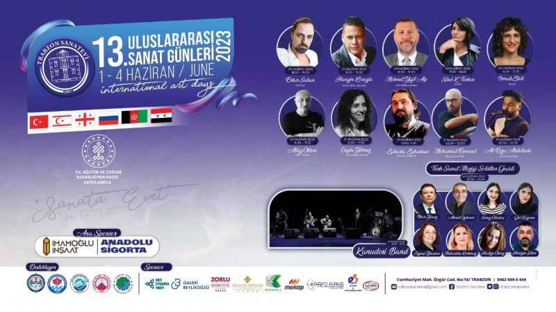 Yerelden, yurt içinde ve yurt dışından farklı sanat disiplinlerinden sanatçıların ve sanat gruplarının katılım sağlayacağı 13. Uluslararası Sanat Günleri bu yıl 01-04 Haziran 2023 tarihleri arasında yapılacaktır. Sanat günleri kapsamında gerçekleştirilecek etkinliklerin tamamı halkımız açık ve ücretsiz olacaktır.Trabzon Sanatevi Başkanı Adnan Taç, sanat günleriyle ilgili olarak şunları söyledi. “Yerelden, ulusal ve Uluslararası boyuttan olmak üzere, sahne sanatları, görsel sanatlar, yazım sanatı ve el sanatları alanlarında önemli isimlerin katılım sağlamasına özen gösterilmektedir. Bu nedenle sanat günlerinin çizgisini her geçen yıl daha da yukarılara çıkarma gayreti içerisindeyiz. Bu yıl sinema ve televizyon dünyasının önemli isimlerinden oyuncu Ertan Saban ve oyuncu Hüseyin Köroğlu, televizyonlara çektiği önemli dizilerden bildiğimiz NTC Medya’nın sahibi yapımcı Mehmet Yiğit Alp, Edebiyat dünyasından Yazar Sibel K. Türker, Yazar Irmak Zileli, Şair-Yazar Altay Öktem, Halk Bilimci Çağla Yılmaz gibi isimler, bizlerle birlikte olacaklar. Sanatın tüm disiplinlerini kapsayan ve geleneksel hale getirilen uluslararası sanat günlerini, ekonomik şartların daha da artan zorlukları altında gerçekleştirmeyi başarmanın gururu ve mutluluğu içerisindeyiz. Yürüdüğümüz bu yolda bizlere destek olan, katkı sağlayan kurum ve kuruluşlarımıza teşekkür ediyorum. Bunca emekle hazırlanan programlarımızda değerli sanatseverlerin salonları doldurmalarını istiyoruz.” Dedi.