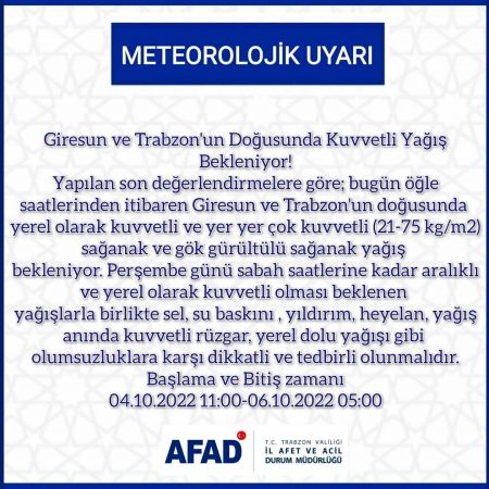 Meteorolojiden yapılan son tahminlere göre; Trabzon ve Giresun'un Doğusunda şiddetli yağış bekleniyor.Yapılan son değerlendirmelere göre; Bugün öğle saatlerinden itibaren Giresun ve Trabzon'un doğusunda yerel olarak kuvvetli ve yer yer çok kuvvetli (27-75 kg/m2) sağanak ve gök gürültülü sağnak yağış bekleniyor. AFAD Trabzon ise uyarılarda bulundu. yapılan uyarı şu şekilde: "Perşembe günü sabah saatlerine kadar aralıklı ve yerel olarak kuvvetli olması beklenen yağışlarla birlikte sel,su baskını, yıldırım, heyelan, yağış anında kuvvetli rüzgar, yerel dolu yapışı gibi olumsuzluklara karşı dikkatli ve tedbirli olunmalıdır. "