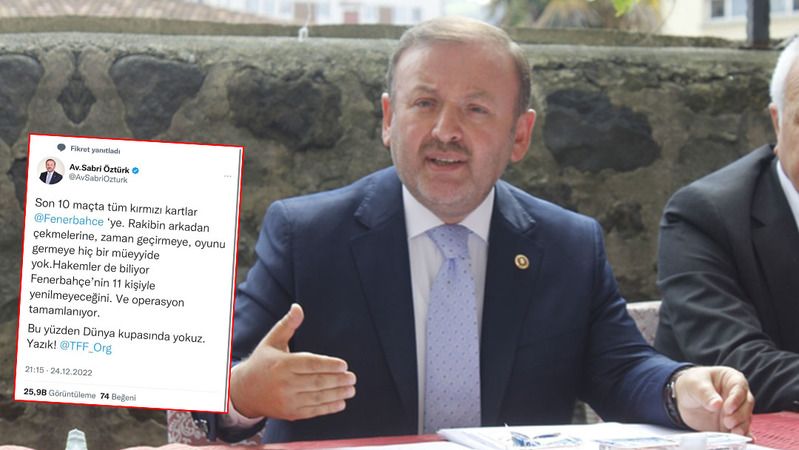 Maçtan 15 dakika sonra klavye başından TFF’ye ayar vermek için harekete geçen Milletvekili Öztürk TFF’nin resmi sosyal medya hesabını etiketleyerek, “Son 10 maçta tüm kırmızı kartlar Fenerbahçe’ye. Rakibin arkadan çekmelerine, zaman geçirmeye, oyunu germeye hiçbir müeyyide yok. Hakemler de biliyor Fenerbahçe’nin 11 kişi yenilmeyeceğini. Ve operasyon tamamlanıyor. Bu yüzden dünya kupasında yokuz. Yazık!” paylaşımında bulundu.