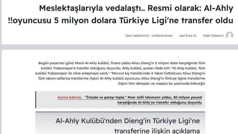 Günebakış'ın haberine göre;Gelecek sezon planlamasını içeren transfer çalışmalarını sürdüren Trabzonspor'un, ilk transferini tamamladığına dair Mısır basınında çıkan haber, Malili orta saha oyuncusu Aliou Dieng'in bordo-mavililere katıldığına işaret ediyor.Trabzonspor'un orta sahasını güçlendirmek amacıyla ön libero mevkisine transfer yaptığı iddiaları arasında yer alan Aliou Dieng'in, 1.85 boyundaki bir orta saha oyuncusu olduğu belirtiliyor.Mısır basınında yer alan habere göre, Aliou Dieng'in transfer ücreti 5 milyon dolar olarak açıklandı. Al-Ahly kulübü de yaptığı açıklamada, Türk kulübü Trabzonspor ile Aliou Dieng'in transferi konusunda nihai anlaşmaya vardıklarını duyurdu.Önümüzdeki günlerde resmi duyurunun yapılması beklenen Aliou Dieng transferiyle ilgili Türkiye'ye gelmesiyle ilgili beklentilerin olduğu ve oyuncunun Al-Ahly kariyerinde 127 maça çıkarak 16 gol attığı ve 18 asistle takımına önemli katkı sağladığı bilgisi paylaşıldı.