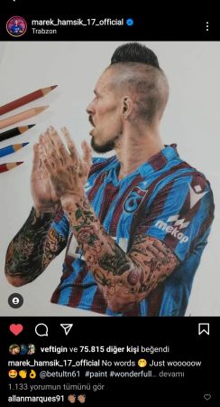 Bu sezon 23 karşılaşmada 2 gol 4 asistlik performans sergileyen Marek Hamsik'e taraftarın yoğun ilgisi devam ediyor. Bir Trabzonspor taraftarının kendisi için hazırlığı özel çizim karşısında şaşkınlığını gizleyemeyen 34 yaşındaki yıldız sosyal medyadan çizimi paylaşarak "Fazla söze gerek yok, harika'' notunu düştü.