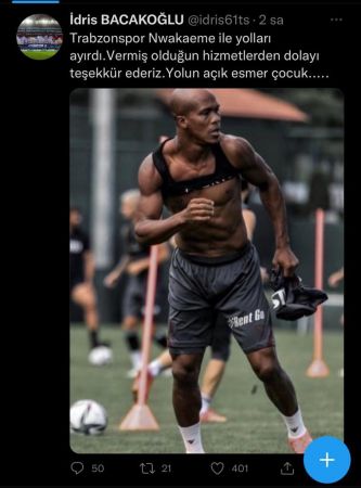 Trabzonspor'da Nwakaeme tartışması devam ederken yeni bir iddia ortaya atıldı. Nwakaeme'nin bordo-mavili ekiple yollarını ayırdı iddia edildi. Sosyal medyada yayılan bu iddia ile ilgili henüz Trabzonspor'dan resmi bir açıklama gelmedi.Nwakaeme'nin gideceği iddialarına Ulaş Özdemir şu sözlerle cevap vermişti:" Bugün yine Nwakaeme ile bir görüşme yapıldı. Ben bu saatten sonra bu işin olumluya döneceğini düşünmüyorum. Nwakaeme'nin Türkiye'den bir takımla anlaşacağını düşünüyorum. Bu İstanbul takımı olmayacaktır." Nijeryalı deneyimli futbolcunun yıllık net 3 milyon euro istediği ve şimdiye kadar gerçekleşen görüşmelerde geri adım atmadığı vurgulandımıştı.Şampiyonlukta büyük pay sahibi olan oyuncu forma giydiği 30 maçta 13 gol atarak 10 asist yaptı.61 medya Trabzon Haber servisi