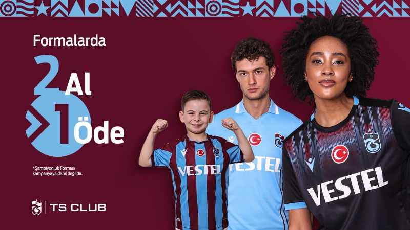 Trabzonspor'dan taraftalarına sevindiren haber. Bordo- mavililer resmi sitesinden yaptığı açıklamada forma kampanyası başlattığını duyurdu.Trabzonspor'dan yapılan açıklamada"Çok beğendiğin 2 forma arasında seçim yapmana gerek yok. Formalarda 2 al 1 öde kampanyası tüm TS Club mağazaları ve http://trabzonspor.com.tr'de seni bekliyor!"