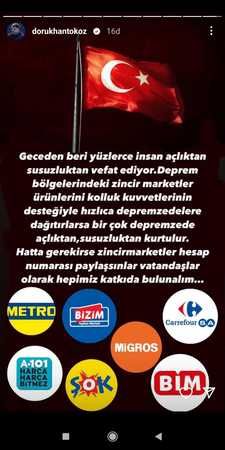 Trabzonspor'un yıldız futbolcularından Dorukhan Toköz, deprem bölgesinde ve bölgeye yakın yerde bulunan zincir marketlere seslendi. Depremzedelerin yoğun yiyecek, içecek ve hijyen malzemesine ihtiyacı olduğu sürekli olarak bildiriliyor. Yardım tırları bölgeye yola çıkmasına rağmen, hava koşulları ve depremden zarar gören yollar nedeniyle bölgeye ulaşım oldukça zor. Süre ilerledikçe insanlar enkaz altından kurtulmuş olsa dahi, açlık, susuzluk, temizlik ve soğuk gibi zorlu koşullarla mücadele etmekte. Trabzonspor'un yıldızı Dorukhan Toköz de tüm bu koşulların ardından zincir marketlere seslenerek. "Ürünlerinizi yarıma ihtiyacı olanlara dağıtın, şu an gün birlik günü, gerekirse zararınızı açıklarsınız elimizden ne geliyorsa yaparız. Elinizde ürün varsa lütfen insanlarla paylaşın" mesajını paylaştı.
