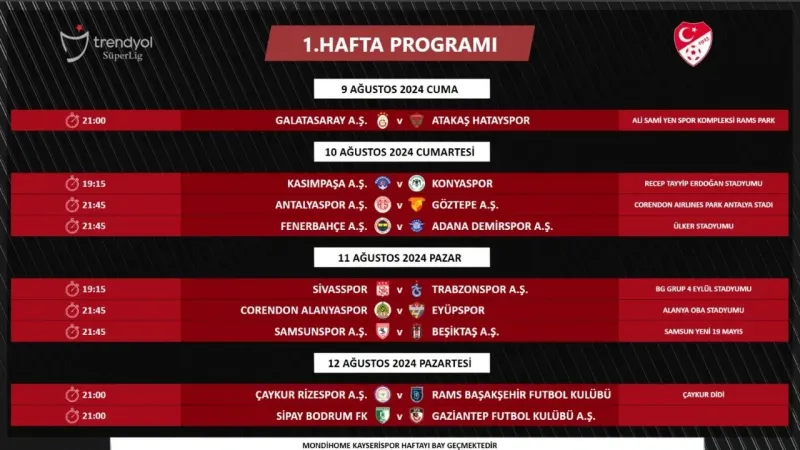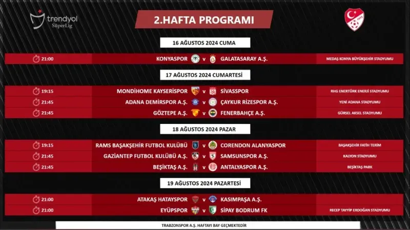Türkiye Futbol Federasyonu (TFF), Trendyol Süper Lig'de 1. ve 2. haftanın müsabaka programını açıkladı. Yeni sezon, 9 Ağustos'ta Galatasaray ve Hatayspor arasındaki karşılaşmayla başlayacak.