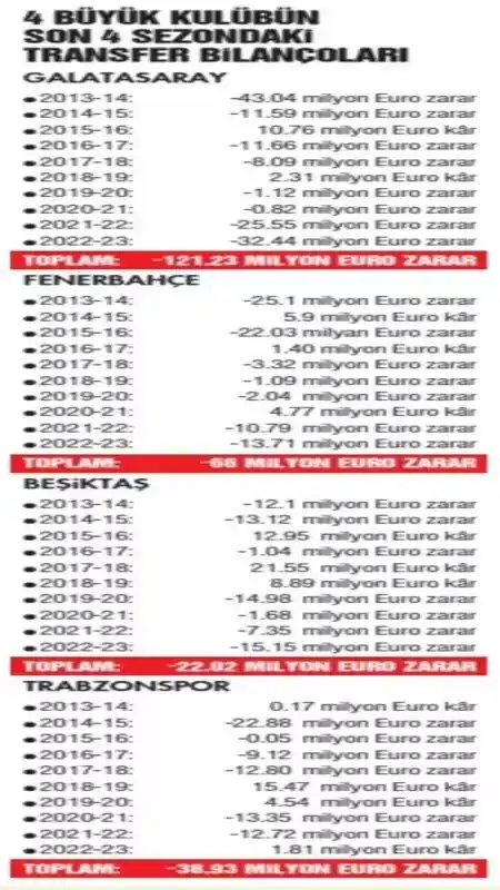 Son 10 sezonda transferlerden kaynaklanan zararlar toplamda 238 milyon Euro (yaklaşık 5.12 milyar TL) olarak gerçekleşti. Bu zararlar, Türk futbolunun dört büyük kulübü olan Beşiktaş, Fenerbahçe, Galatasaray ve Trabzonspor tarafından yaşandı.